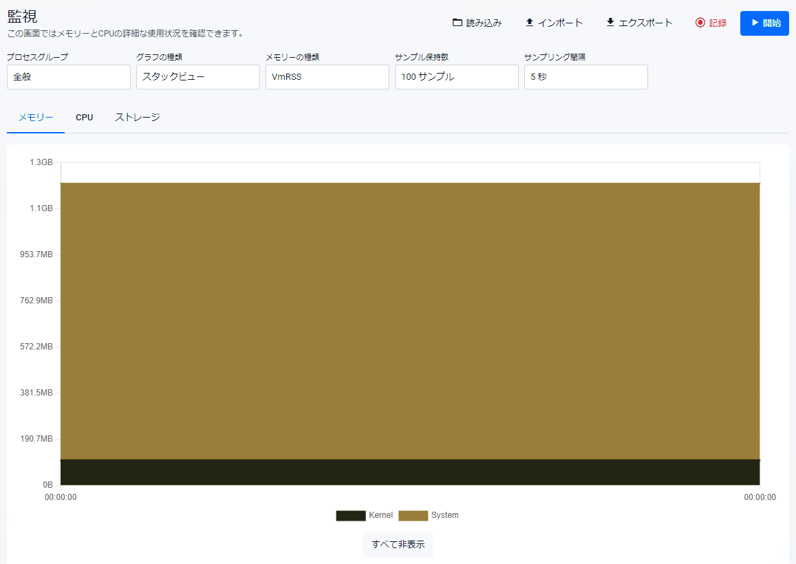 | 「開始」ボタン | サンプルの収集を開始します(ブラウザーのメモリー上に保持)。収集中は「サンプル保持数 × サンプリング間隔」の間、GUIタイムアウトが無効になります |