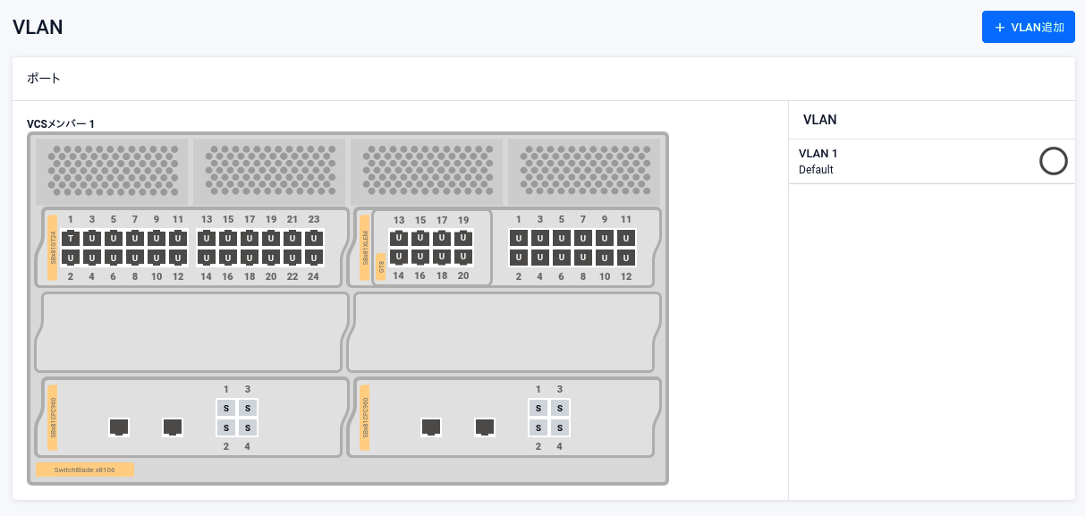 | ポート | 各スイッチポートのタグ設定と所属VLANが視覚的に表示されます。 ・無色U - 初期設定ポート(明示的なVLAN設定のない、vlan1所属のタグなしポート) ・U - タグなしポート(アクセスポート) ・T - タグ付きポート(トランクポート) 各ポートの所属VLANは、該当ポートにマウスカーソルを当てると表示されるポップアップによって確認できます。 また、タグなしポートでは所属VLANが「VLAN」一覧の色でも示されます。 一方タグ付きポートは、「VLAN」一覧で選択中のVLANに所属していれば背景色が該当VLANの色になり、そうでなければ背景色が濃い灰色になります。 ポートをクリックまたはマウスカーソルを当てることで該当ポートのタグ設定と所属VLANの変更およびネイティブVLANの設定をすることもできます。詳細は「タグ設定・所属VLANの変更・ネイティブVLANの設定」をご覧ください |