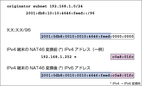 たとえば、eth1に2001:db8:10:10::1/64が割り当てられている場合、IPv4アドレス192.168.1.11は、eth1のIPv6プレフィックス「2001:db8:10:10::/64」と「192.168.1.11(16進数表記で c0a8:10b)」を組み合わせた「2001:db8:10:10::c0a8:10b」に変換される。