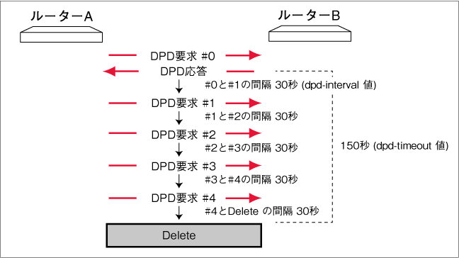 初期設定(dpd-interval 30、dpd-timeout 150)の場合のシーケンスを次に示します。