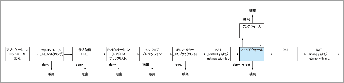 アプリケーションコントロール(DPI)機能では、各アプリケーション固有の通信パターンを検出するために一定量のパケットを受信してそのデータ部分を検査する必要がありますが、ファイアウォールはその仕様として初期設定ですべてのパケットを破棄するため、ファイアウォールとアプリケーションコントロール(DPI)を併用する場合は注意が必要です。詳しくは「UTM」/「アプリケーションコントロール(DPI)」 をご覧ください。