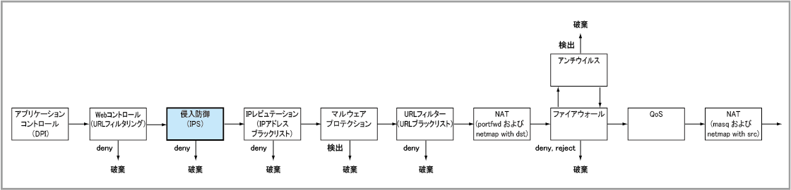 侵入防御(IPS)機能の処理は、ブリッジング用、ルーティング用の両インターフェースで受信したパケットに対して行われます。