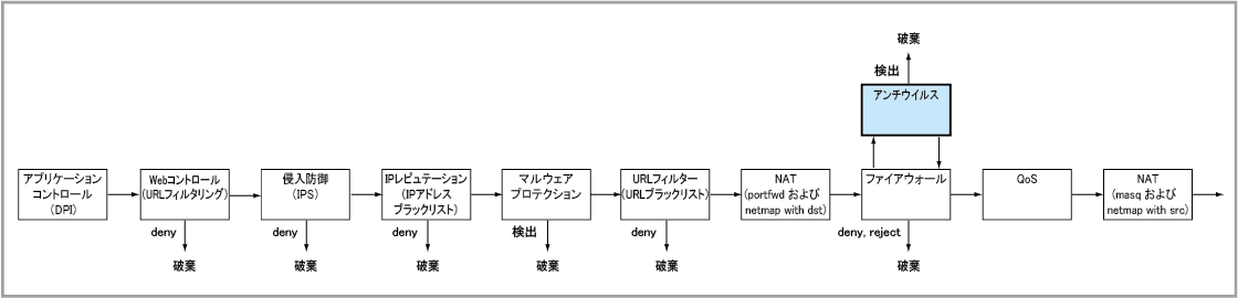Noteアンチウイルス機能とファイアウォール機能を併用する場合は、ウイルス定義データベースを更新するため、本製品からインターネットへのDNS通信とHTTPS通信を許可する必要があります。また、アプリケーションコントロール(DPI)機能でサンドバイン社のアプリケーションシグネチャデータベースを使用している場合は、本製品からインターネットへのSSL通信も許可する必要があります。