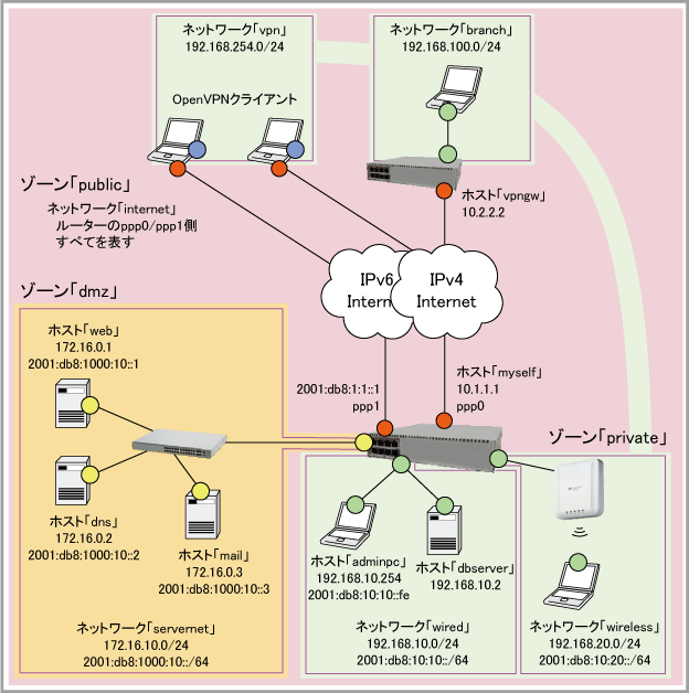 awplus(config)# zone public ↓ awplus(config-zone)# network internet ↓ awplus(config-network)# ip subnet 0.0.0.0/0 interface ppp0 ↓ awplus(config-network)# ipv6 subnet ::/0 interface ppp1 ↓ awplus(config-network)# host myself ↓ awplus(config-host)# ip address 10.1.1.1 ↓ awplus(config-host)# exit ↓ awplus(config-network)# host vpngw ↓ awplus(config-host)# ip address 10.2.2.2 ↓ awplus(config-host)# exit ↓ awplus(config-network)# exit ↓ awplus(config-zone)# exit ↓