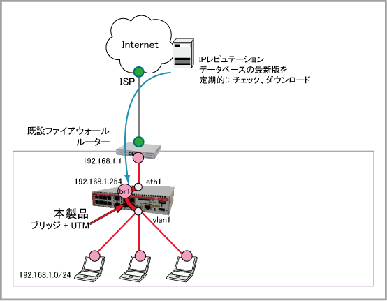 既存のルーターと端末の間に、ブリッジとして動作するよう設定した本製品を設置することにより、ネットワークの設定等を変更せずにUTM機能を利用可能です。