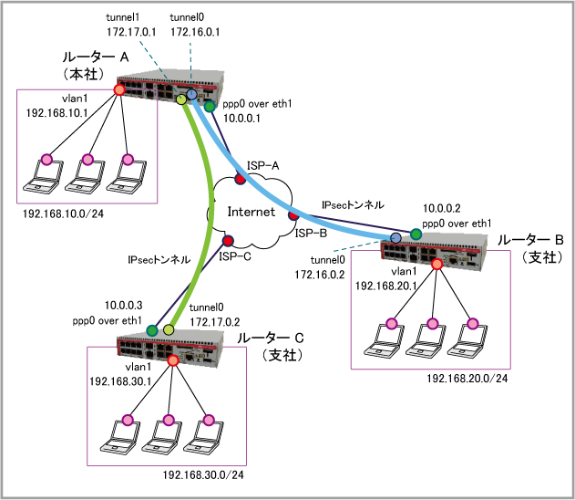 | WAN側(ppp0)IPアドレス | 10.0.0.1/32 | 10.0.0.2/32 | 10.0.0.3/32 |