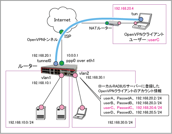 | ユーザーA | userA | passwdA | 192.168.20.2/24 |