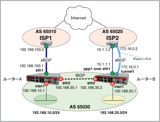AS 65030は3つのサブネット(プレフィックス)を持っており、ルーターAのeth1インターフェース経由でISP1(AS 65010)と、ルーターBのppp1インターフェース経由でISP2(AS 65020)と接続しています。