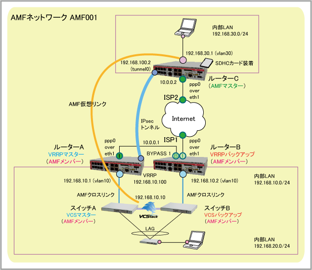 | AMF仮想リンク | 192.168.30.1(ルーターC:AMFマスター) - 192.168.10.10(スイッチA/B:VCS構成のAMFメンバー) | ||