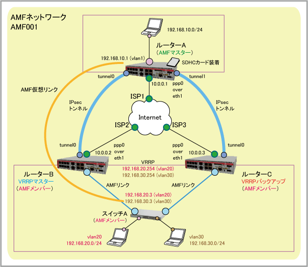 | AMF仮想リンク | 192.168.10.1(ルーターA:AMFマスター) - 192.168.20.3(スイッチA:AMFメンバー) | ||