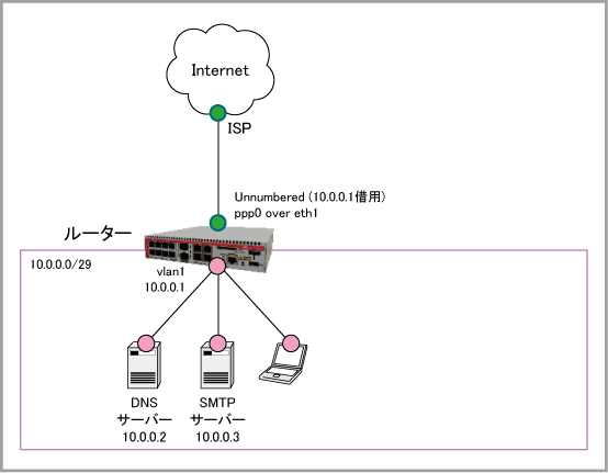 ISPから割り当てられているアドレス(10.0.0.0/29)は8個(10.0.0.0~10.0.0.7)ですが、ネットワークアドレス(10.0.0.0)、ブロードキャストアドレス(10.0.0.7)、ルーター自身のvlan1アドレス(10.0.0.1)にそれぞれ1個ずつ消費されるため、端末に設定できるアドレスは10.0.0.2 ~ 10.0.0.6の5個となります。