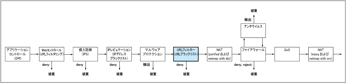 NoteURLフィルター(URLブラックリスト)とWebコントロール(URLフィルタリング)は別の機能です。Webコントロールでは、アクセス先のWebサイト(URL)をカテゴリーに分類し、カテゴリー単位でアクセスの拒否・許可を制御します。一方、URLフィルターは、個々のアクセス先URLを、ブラックリスト、ホワイトリストに記述されたパターンと照合して拒否・許可を制御します。また、もう一つの違いとして、Webコントロールではアクセス元クライアントごとの制御を行いますが、URLフィルターの制御はすべてのWebアクセスに適用されます。なお、両機能は併用が可能です。併用時は両機能で許可されたときだけWebアクセスが可能です。