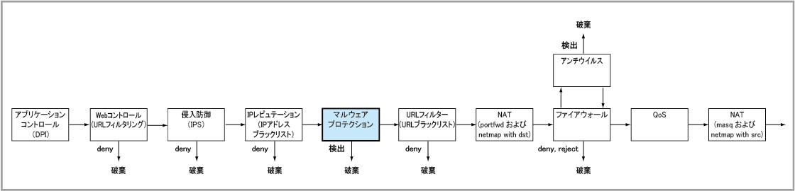 NoteUTMバンドルライセンス「UTM-01:アプリケーションコントロール、Webコントロール」または「UTM-02:IPレピュテーション、アドバンスドIPS」を適用してこれらのライセンスの対象機能を使用している場合、マルウェアプロテクション機能は使用できません。