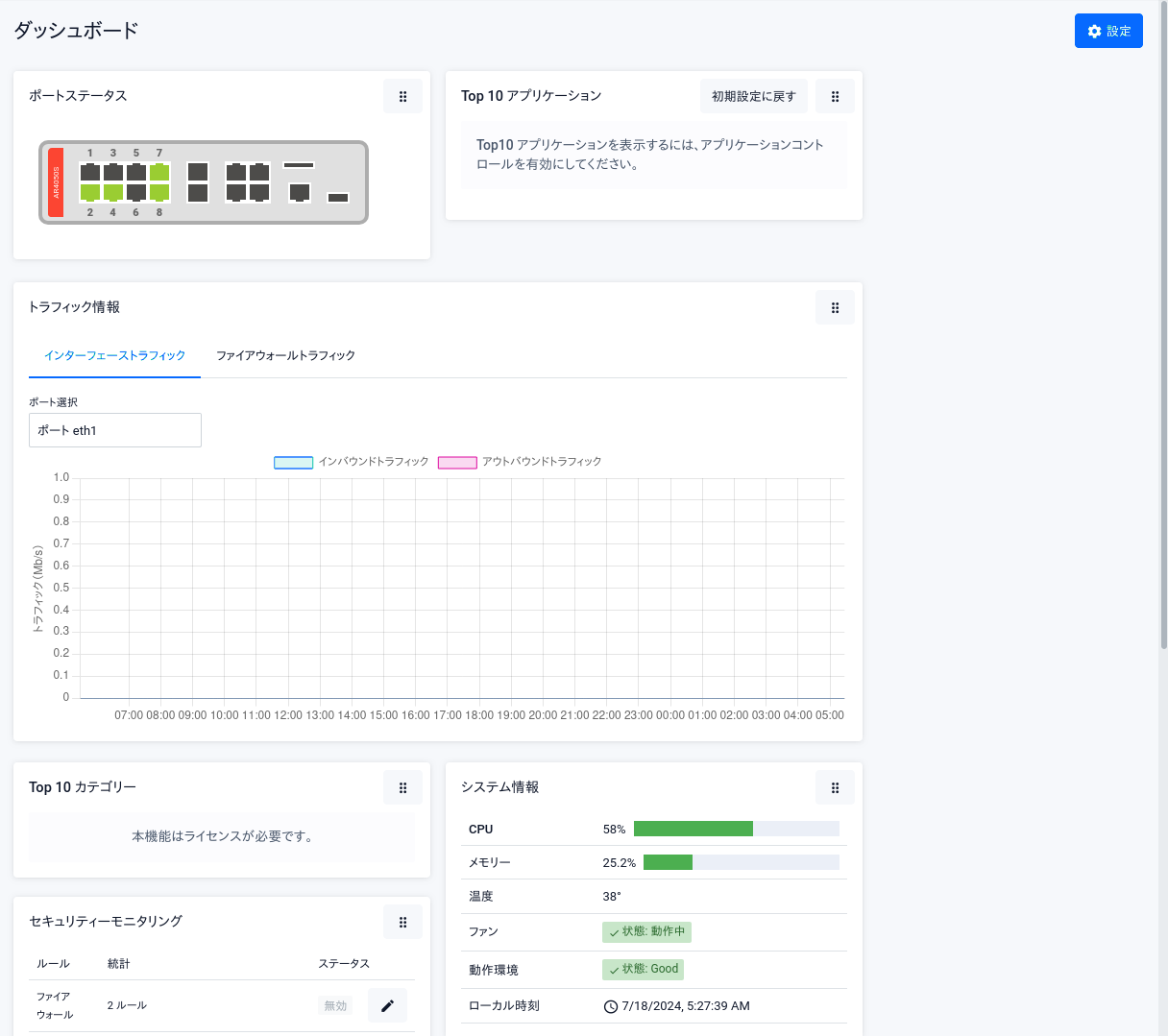 - インターフェーストラフィック - インターフェースごとのトラフィック統計(「eth1」...で表示するインターフェースを切り替えます)