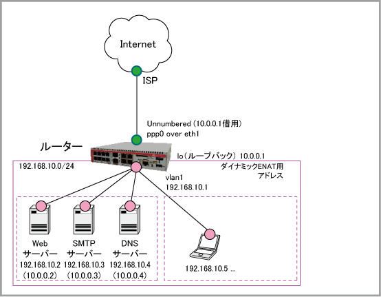 ・rule 10 - 内部のコンピューターがダイナミックENAT機能を使用できるようにします。なお、本例ではWAN側がUnnumberedのため、「with src public.wan.ppp0」により、変換後のアドレスとして10.0.0.1を指定しています。