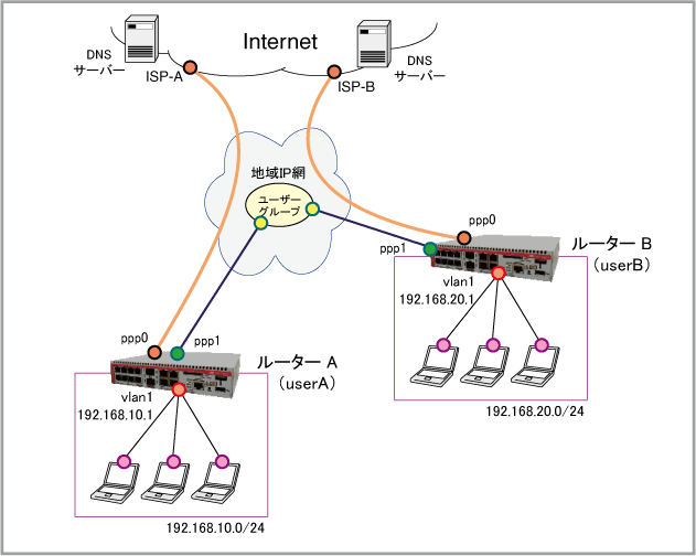 PPPoEセッションを2本使い、インターネット(ISP)接続とCUG(Closed Users Group)サービス(フレッツ・VPNワイド、フレッツ・グループアクセス(プロ、NTT東日本)、フレッツ・グループ(ビジネスメニュー、NTT西日本))の「LAN型払い出し」を同時に利用します。パケットの振り分けはスタティックな経路制御により行います。