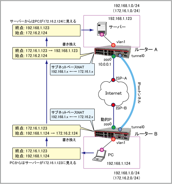 | LAN側(vlan1)内部NAT後IPアドレス | 172.16.1.x/24 | 172.16.2.x/24 |