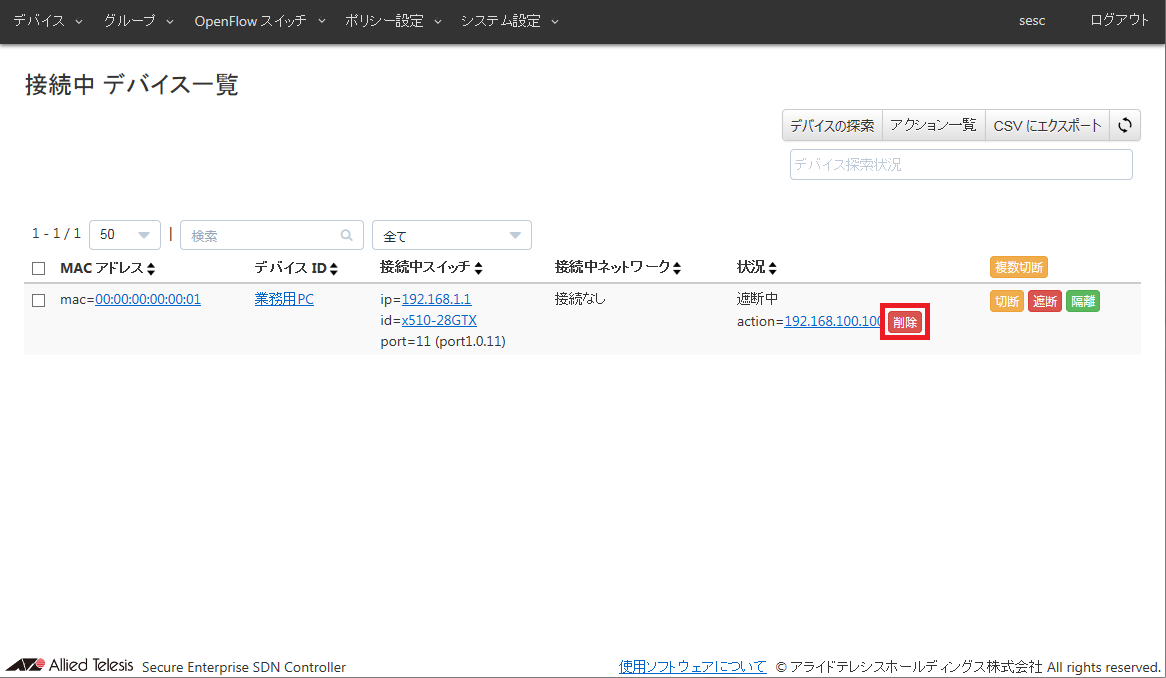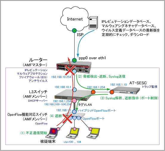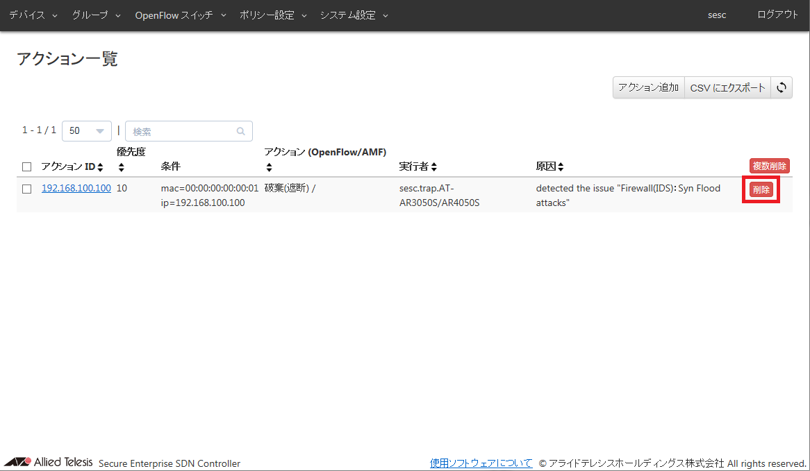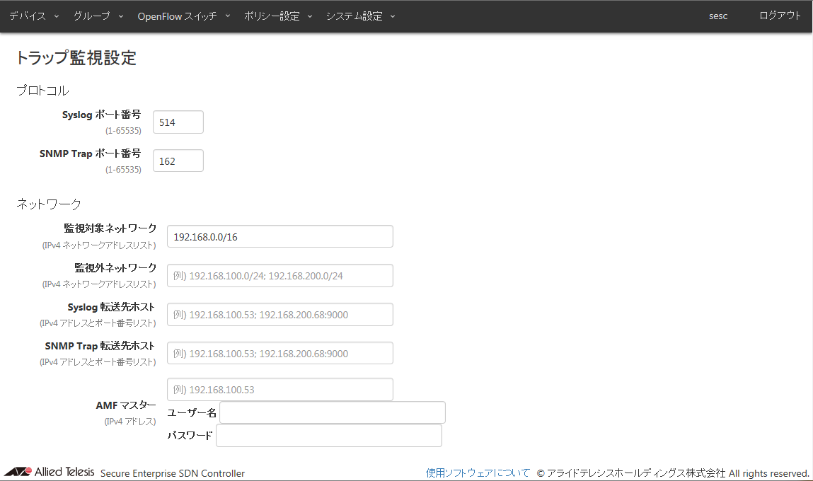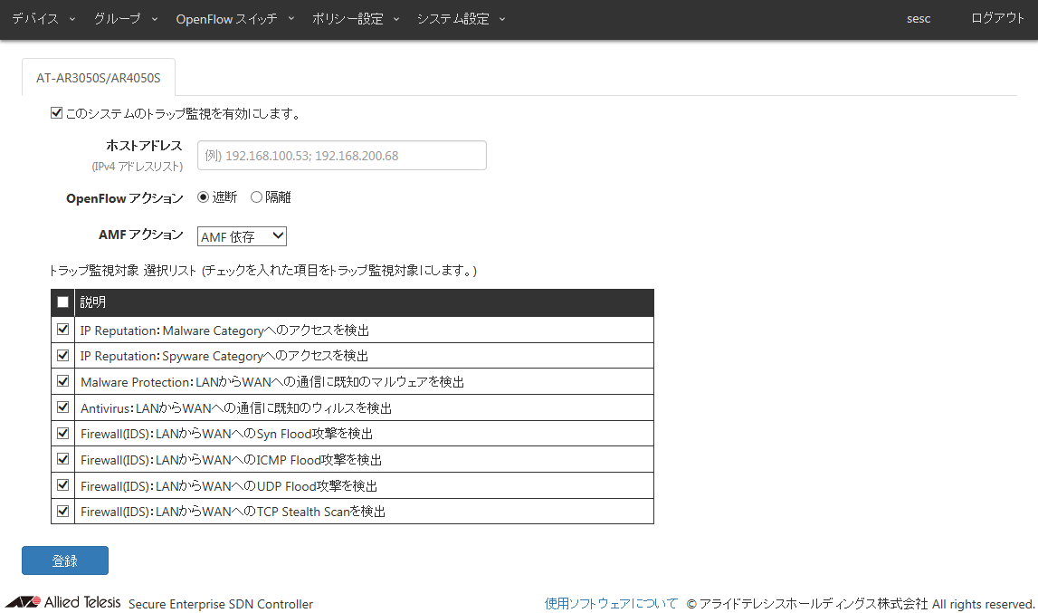 - バージョン 1.3.1 以前のAT-SESC と UTM機能との連携を行うには、UTM連携に対応したトラップ監視ルールファイルを AT-SESC にアップロードする必要があります。トラップ監視ルールファイルは、弊社「Secure Enterprise SDNテクノロジー パートナープログラム」を通じて提供されます。パートナープログラムの詳細は、弊社ホームページより「Secure Enterprise SDNテクノロジー パートナープログラム」をご覧ください。