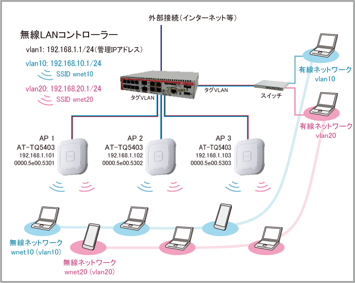 | 1 | 192.168.1.0/24 | 無線LANコントローラーと管理下APの通信に使用する管理用VLAN |