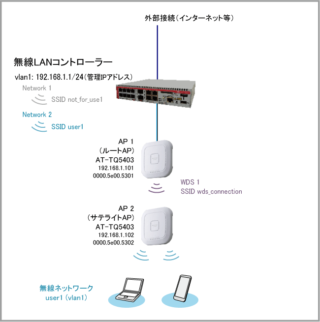 WDSでは、無線LANコントローラー管理下のネットワークに直接接続された無線APをルートAP、WDS接続を経由して無線LANコントローラー管理下のネットワークと通信を行う無線APをサテライトAPと呼びます。