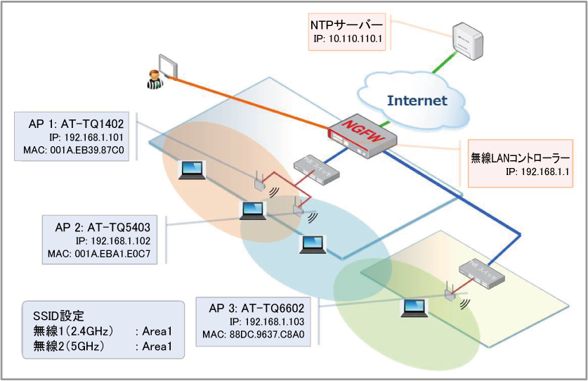 無線LANコントローラー配下のAPに同一のSSIDとセキュリティー設定を行うことでAP間のローミングを可能にし、またAWCによって管理下の各APにとって最適な送信出力とチャンネルを適用します。