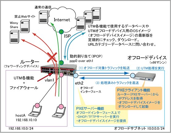 UTMオフロードは、一部のUTM機能の処理を他のコンピューター(オフロードデバイス)に委託(オフロード)する機能です。
