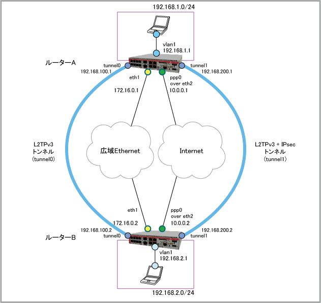 | L2TPv3トンネルIPアドレス(2) | 192.168.200.1/30 (tunnel1) | 192.168.200.2/30 (tunnel1) |
