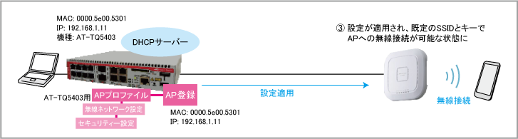 awplus# wireless auto-config ap-profile 1 ↓ap-profileを指定した場合は、検出したAPのうち、APプロファイルで指定した機種(hwtype)と一致するものだけがセットアップの対象になります。