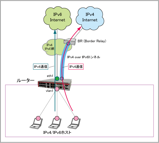 MAP-EによってIPv4 over IPv6トンネルを構築し、NTT東日本・NTT西日本が提供するフレッツ 光ネクスト回線を経由してIPv4インターネットに接続するための設定例です。