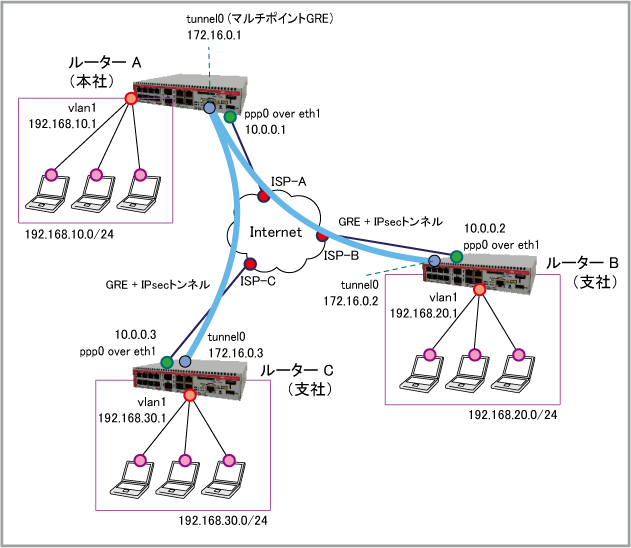 | LAN側(vlan1)IPアドレス | 192.168.10.1/24 | 192.168.20.1/24 | 192.168.30.1/24 |