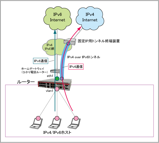 IPv4 over IPv6トンネルインターフェースを使用して、NTT東日本・NTT西日本が提供するフレッツ 光ネクスト回線を経由してIPv4インターネットに接続するための設定例です。