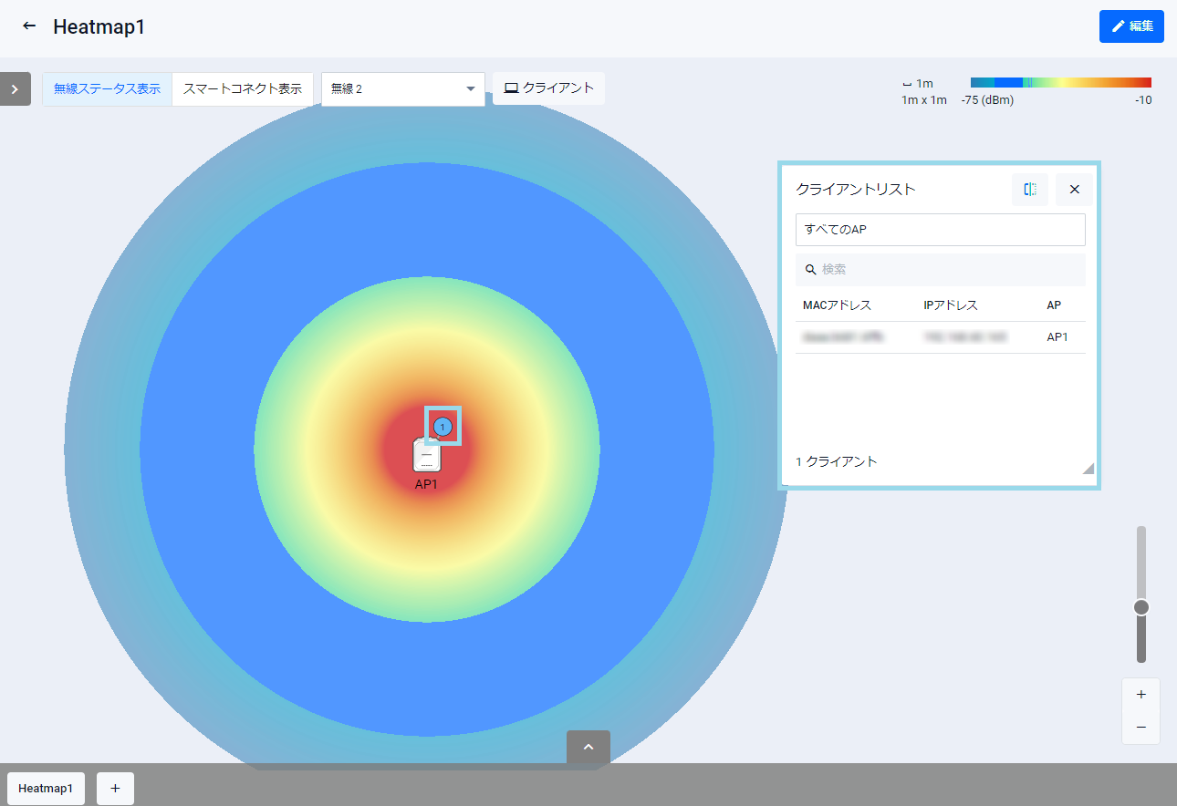 ヒートマップ上の各APに接続している無線クライアントの情報が表示されます。詳しくは、各APに接続している無線クライアントを確認する をご覧ください。
