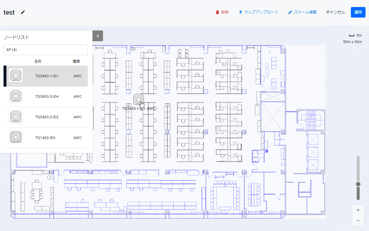 ヒートマップ編集画面では、背景画像やスケール(縮尺)、AP配置の変更やヒートマップの削除が可能です。