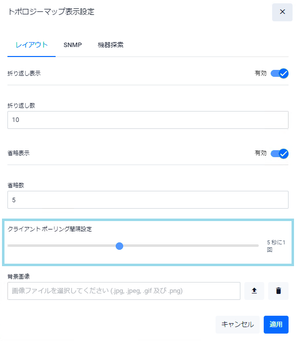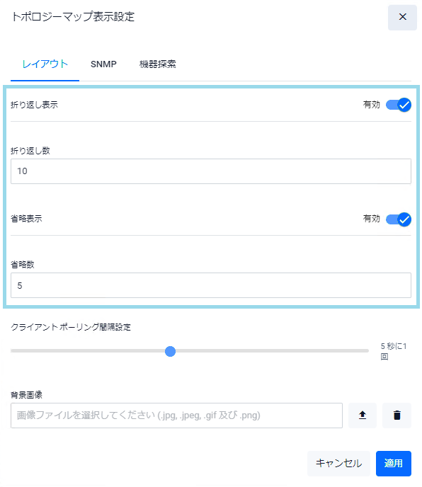 トポロジーマップにおけるノードアイコンの集約・展開表示 を変更するためのボタンです。クリックにより「トポロジーマップ表示設定」 が表示されます。
