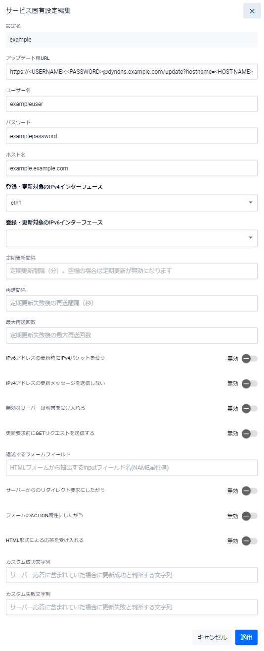 | IPアドレス | 対象インターフェースに設定するIPv4アドレスを「192.168.101.1/24」の形式で入力してください。空欄(未定義)の状態で「適用」ボタンを押した場合は該当インターフェースのIPv4アドレスが削除されます |