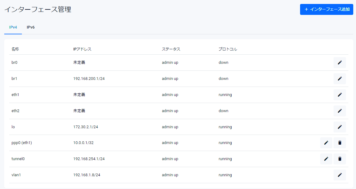 | 削除ボタン | 該当インターフェースを削除します。削除できないインターフェースには「削除」ボタンは表示されません |