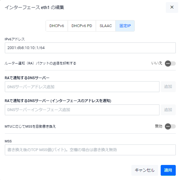 | IPv6アドレス | 対象インターフェースに設定するIPv6アドレスを「2001:db8:10:10::1/64」の形式で入力してください。空欄(未定義)の状態で「適用」ボタンを押した場合は該当インターフェースのIPv6アドレスが削除されます |