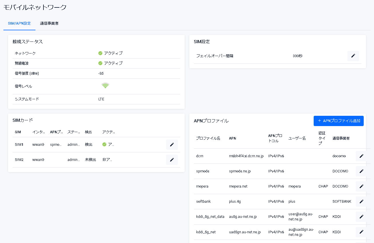 | APNプロファイル | SIMスロットで使用するAPNプロファイル名が表示されます |