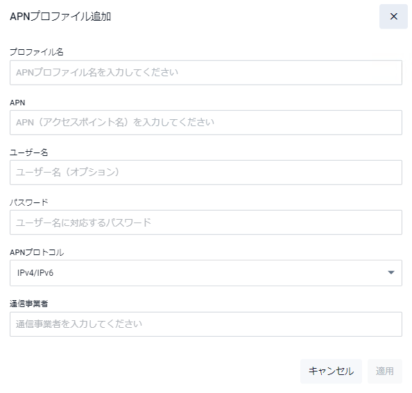 | 通信事業者 | APNプロファイルで使用する通信事業者を入力してください |