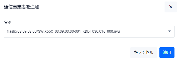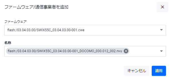 | 適用ボタン | ファームウェアと通信事業者設定(PRIファイル)を追加してCarriers画面に戻ります |