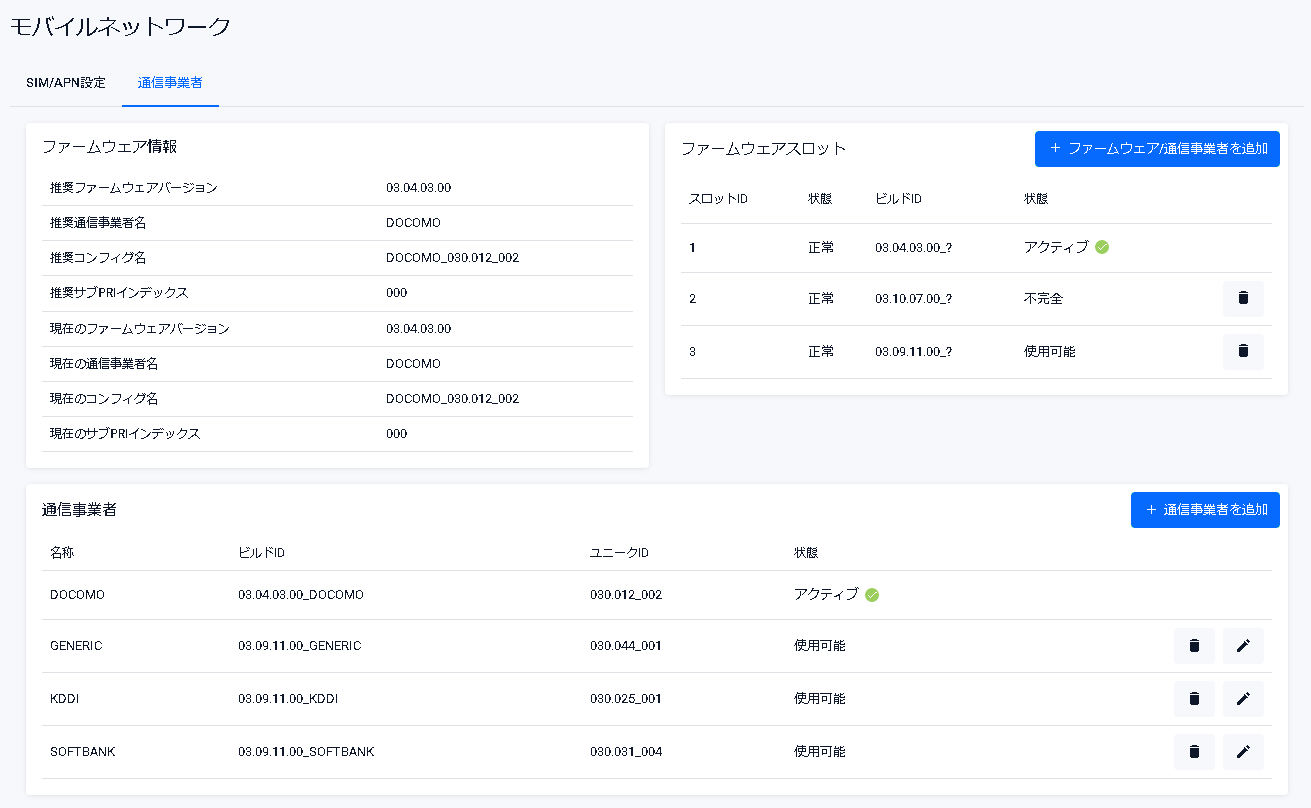 | 削除ボタン | 該当スロットに格納されたファームウェア/通信事業者設定を削除します。削除前には確認のダイアログが表示されます |