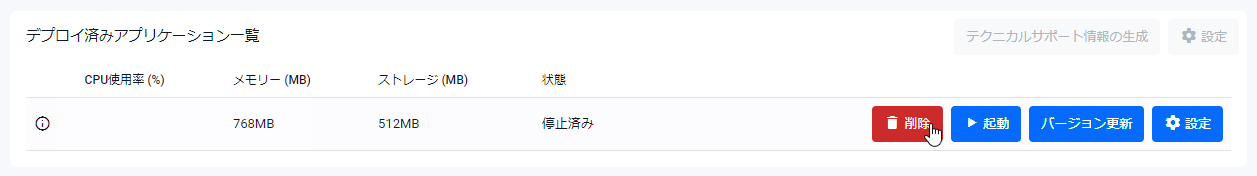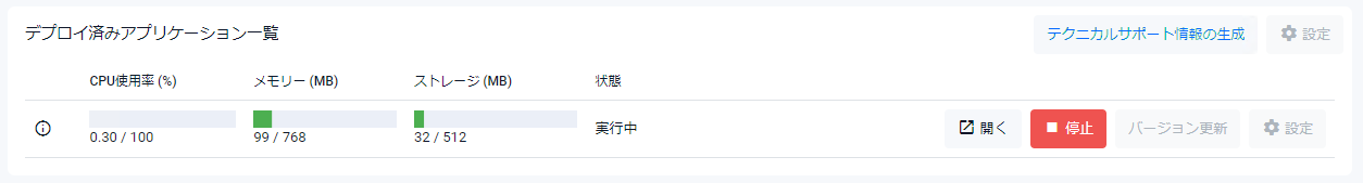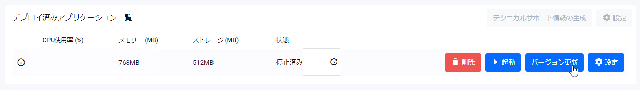 | バージョン更新ボタン | アプリケーションイメージのバージョンを変更したいときは、インスタンスを停止してからこのボタンをクリックしてください |