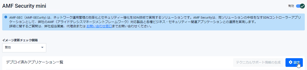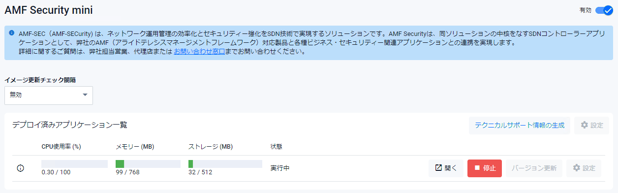 Noteバージョン 2.2.x以前からバージョン2.5.x以降へバージョン更新を行った場合は、AMF Security miniにライセンスをインストールする必要があります。AMF Security miniのライセンスについては『AMF Security miniリファレンスマニュアル』の『設定画面へのアクセス / 設定の開始 / ライセンスのインストール』をご参照ください。