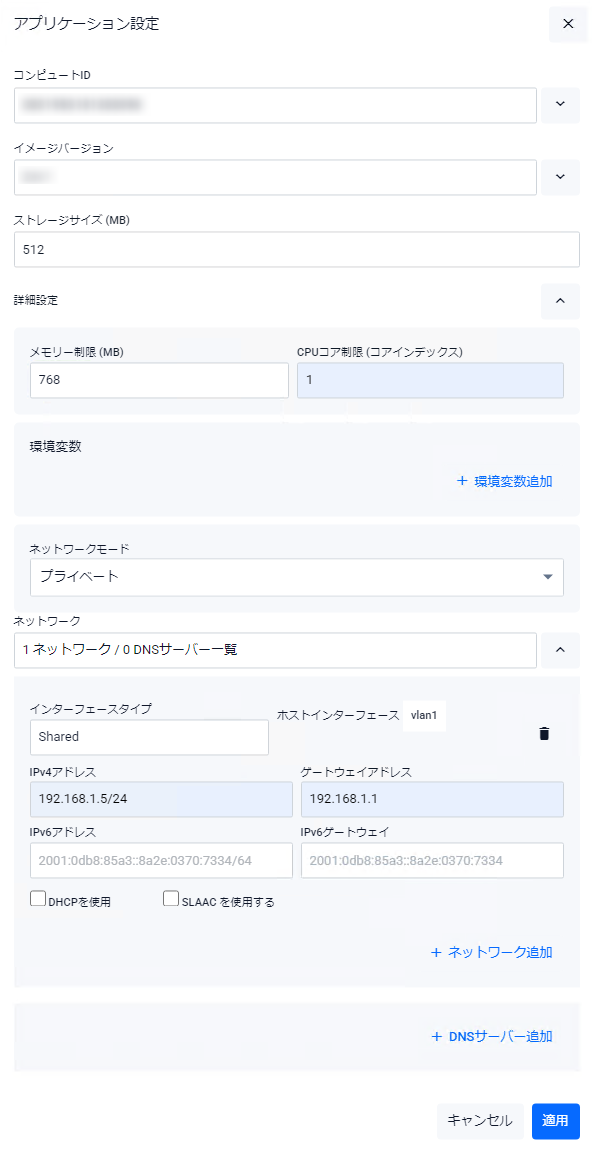 | ホストインターフェース | ネットワークタイプSharedの場合、インスタンスの仮想ネットワークが接続される本製品のインターフェース名が表示されます |