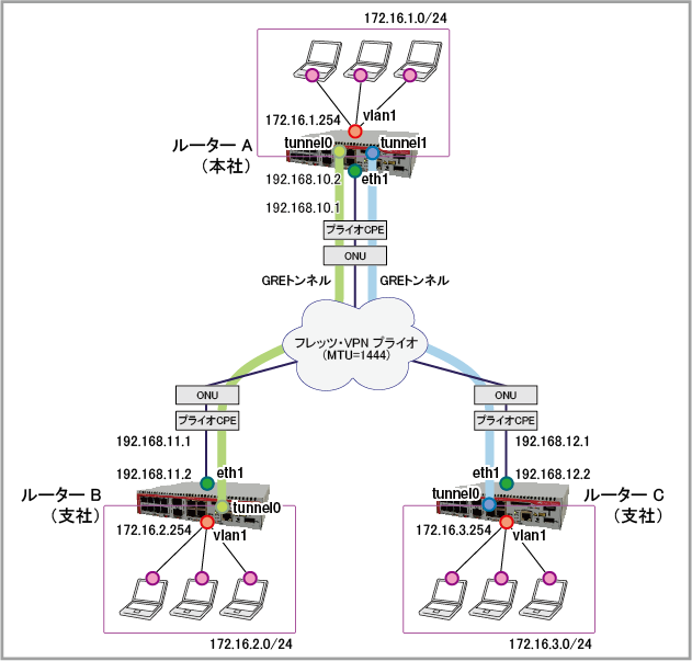 設定例集#90: フレッツ・VPN プライオを利用した3拠点間GRE接続