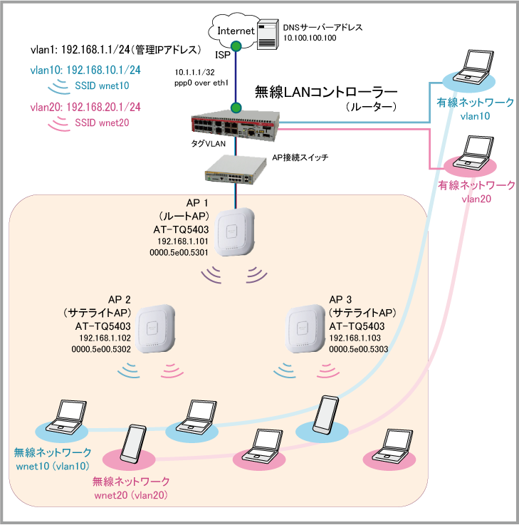 10 192.168.10.0/24 ユーザーVLAN。無線ネットワーク wnet10 はこのVLANに所属する