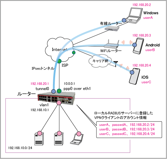 | ユーザーA | userA | passwdA | 192.168.20.2/24 |