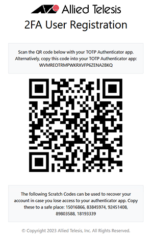 TOTP方式では、管理者があらかじめシークレットキー(パスワード)を生成して各ユーザーに通知するだけでなく、本製品上に用意される専用のWebページからユーザー自身が2FAの利用登録を行うことも可能。