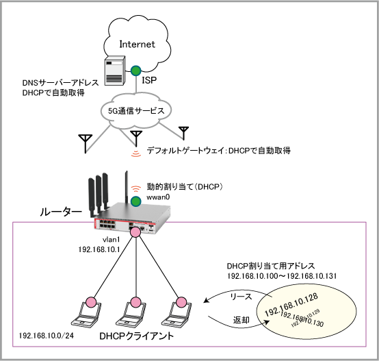 AT-AR4050S-5Gの内蔵ワイヤレスWANモジュールを利用して、5G通信サービス経由でインターネットサービスプロバイダー(ISP)に接続します。