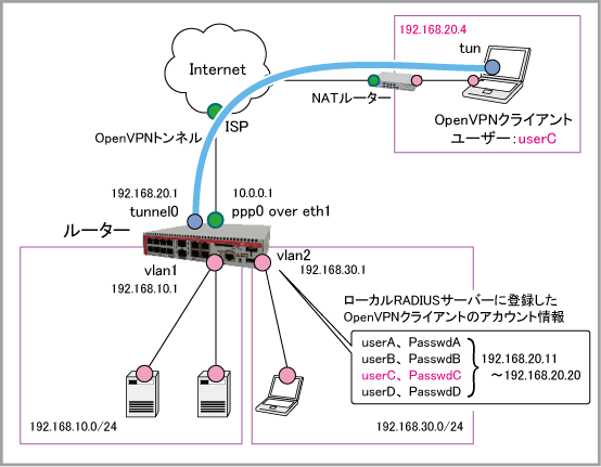| ユーザーA | userA | passwdA | 192.168.20.11~192.168.20.20から割り当て |